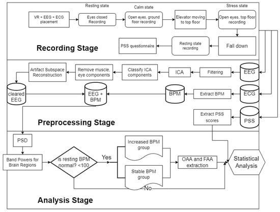 In this section, we describe the experimental protocol of this research, the EEG and electrocardiographic (ECG) data preprocessing, the feature extraction procedure, and the statistical methods used for the analysis of the participants. A complete flowchart of the experiment can be found in Figure 1. Our methodology includes three basic stages. The Recording, the Preprocessing, and the Analysis stage. The former is the experimental and signal acquisition process stage, which is explained in detail in Section 2.2. In the second stage, the signals are properly handled to be analyzed later by implementing techniques such as artifact removal, heartbeat per minute extraction, etc. The details of this stage are laid out in Section 2.3. The latter stage incorporates signal analysis techniques and statistical methodologies that investigate our scope/hypothesis and lead to our results and conclusions. Those can be found in Section 2.4 and Section 2.5.