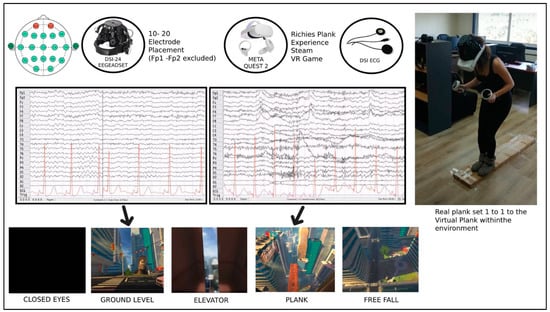 Richie’s Plank Experience steam game is a VR game that makes the participant enter an elevator, takes them to the top floor of a skyscraper, and allows them to walk over and finally jump off a plank extending over the edge of the building. In this experiment, a wooden plank with same dimensions as the virtual one was fixed on the floor so that the participants could walk on it. First, the devices (EEG, ECG and HMD) were placed on the participants. They were given time to familiarize themselves with the equipment and later were asked to close their eyes while standing up for 1–2 min, during which a resting state recording was obtained. Then, they were asked to open their eyes, where they would find themselves in the virtual environment, inside an elevator with the door open, on the ground floor of a building. They were urged to look around them and explore their surroundings without leaving the elevator, with the EEG and ECG devices recording for whole duration of the experiment. Next, they were instructed to press a button inside the elevator. The door closed, the elevator moved to the top floor, and the door opened again. At that point, the participants were told that they should walk on the plank in front of them (at that time, they would realize the actual plank laying in front of them). When they reached the far side of the plank, they were asked to jump. This part of the experiment—after the elevator door opening, walking on the plank, and finally being asked to jump off the building—was considered the stressful stimuli. At the end of the experimental part, the participants were informed that this experiment was about assessing stress system mobilization through VR HMD and were asked to fill the Perceived Stress Scale questionnaire []. Table A1 in the Appendix section contains the results of the PSS questionnaire for every participant along with their age, gender, and previous VR experience. Figure 2 illustrates the experimental design of this study.