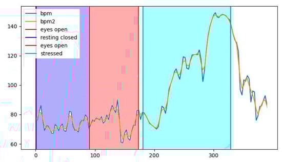 The ECG signal preprocessing consisted of the following steps. First, a FIR filter was applied. Next, a peak enhancement function was used to normalize the amplitude and increase the R-peak amplitude in comparison with the rest of the signal. To perform the R-peak detection, an adaptive peak detection threshold was set. After the peaks were detected, a sliding window of 6 seconds was applied to calculate the BPM for each time point. Finally, 3-second-window averaging was applied to the BPM signal for smoothing. The ECG signal was also segmented into three parts: resting state, calm state, and stressed state.