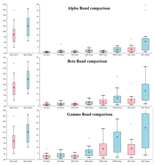 Calm and stressed state comparison of BPM and alpha, beta, and gamma bands. FR represents frontal cortex, PAR represents parietal cortex, TEMP represents temporal cortex, and OCC represents occipital cortex. The “+” sign at the top of the boxplots represents extreme values.