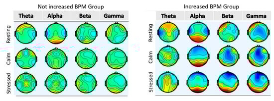 Figure 5 indicates the need for examining whether this activation was related to stress caused by visual stimuli. To do this, we created two groups of participants. The first group consisted of subjects with a normal baseline heart rate (BPM < 100) which was not increased by more than 13 BPM during the stressful condition. The second group consisted of subjects with a normal baseline heart rate which increased by more than 13 BPM during the stressful condition; the threshold of 13 BPM (0.22 Hz) was chosen after studying the available literature []. A BPM increase of more than 13 was considered a significant increase, while an increase smaller than 13 was considered non-significant. Group 1 consisted of seven participants. Group 2 consisted of nine participants. Two participants were left out because of high baseline BPM. Figure 6 is a scalp heatmap comparison of the brain activity between a participant from Group 1 with one from Group 2. Different colors represent the difference from the average Power Spectral Density of the brain for each band expressed in 10 × log10 (uV2/Hz). The heatmap limits are from −8 (deep blue) to +8 (deep red). Figure 7a represents the comparison of the BPM increase between the two groups. Figure 7b represents the comparison of the occipital activity of the two groups. This comparison points out that occipital activity may be an indicator for stress system activation due to visual stimulation.