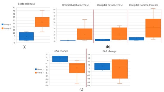 (a) Increase in BPM between groups. Y-axis is average BPM in stressed state minus average BPM in calm state. (b) Increase in occipital activity compared between groups. Y-axis is Power Spectral Density (PSD) calculated in uV2/Hz * 1011 in stressed state minus PSD in calm state. (c) OAA and FAA change compared between groups. Y-axis is OAA in stressed state minus OAA in calm state and FAA in stressed state minus FAA in calm state, respectively, calculated as mentioned in Section 2.4.2.