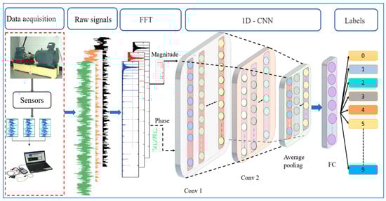 Thus, the fault diagnosis model framework in this study was developed via a three-step approach, as shown in Figure 2. The primary step involved the vibration signal acquisition from the equipment. The second step consists of the pre-processing approach to convert the raw signals into training samples that are made up of a set of input data with associated class labels. In addition, the pre-processing step comprises two main parts, namely noise injection and FFT representation, which are further discussed in Section 3.1 and Section 3.2. Finally, a four-layer lightweight 1D-CNN for fault classification was developed.