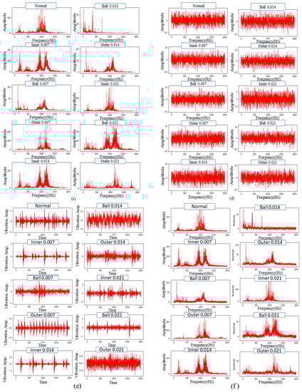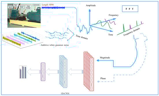 In general, the time domain or the frequency domain can be used to analyse the signals. The signal properties are more distinct when time-domain signals are converted to frequency-domain signals since the latter signals are less influenced by noise compared to the former signals [43]. The presence of a fault characteristic frequency would amplify the signal component amplitudes that are associated with the characteristic component amplitudes that are associated with the characteristic fault frequency, which allows the detection of the failed bearing location through the initial vibration signal of the frequency components, which corresponds to the nature of the bearings [38,44,45]. Considering the significant noise interference at industrial sites, it is, therefore, necessary to examine the anti-noise capacity of a particular model and address the strong noise hindrance.