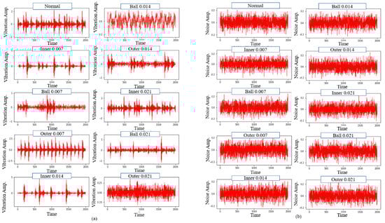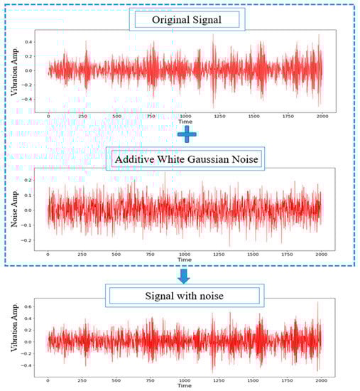 where and represent the signal power and noise power, respectively. The additive White Gaussian Noise (WGN) was employed to amplify the original signal fault, as shown in Figure 3. This was in line with past studies that stated the use of White Gaussian noise to train the network as an effective method to carry out model regularisation. Thus, enhancing the model’s robustness against input variation [55]. Moreover, the SNR of the composite noisy signal was set to 0 dB, indicating the equal value of the noise power to the original signal power, as depicted in Figure 4. The proposed CNN model was then evaluated using the noisy signals with an amplitude range of −10 to 10 dB.
