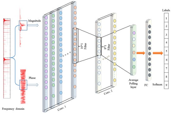 Given that the FFT domain is complex-valued, the data was represented using a phaser notation, which separates the magnitude and phase into two groups of inputs for the 1D-CNN to exclude complex computations, as depicted in Figure 6. Both components provide essential features to classify the bearing fault type, where the phase ensures similar signals’ correctness and diversity, while the magnitude peaks highlight interesting features. In comparison, previous work that employed FFT only considered the magnitude and overlooked the critical information in the phase for the signal representation. The present study applied FFT to convert a fixed window size of 4096 from the time-domain input signal to the desired window size and sampling size, which is explained further in Section 4.1.