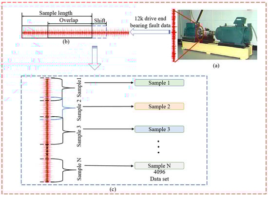 (a) CWRU bearing experimental platform, (b) Data augment with overlap, and (c) Vibration signal expansion mode.