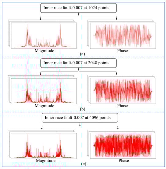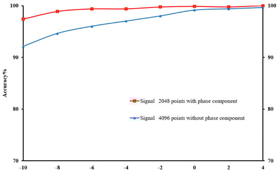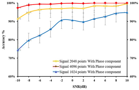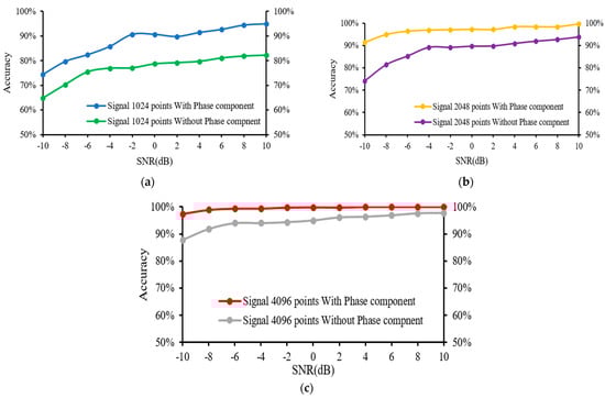 The entire 4096 lengths of the frequency spectrum were analysed in this experiment. The sampling lengths of (a) 1024, (b) 2048, and (c) 4096 correspond to their frequency spectrums, which were composed of 1024, 2048, and 4096 points, respectively. The frequency of the k-th point is k × (fs.max/N) Hz, and these points represent various frequency features. It was observed that longer signals could produce high-resolution frequency spectrums using more points, allowing a more complete and accurate expression of the frequency-domain information. Additionally, the increase in sampling length leads to a more precise measure of the frequency features as well as more prominent discrimination between the adjacent points. Figure 10 illustrates the diagnosis results of the 1D-CNN model under varying SNRs, while Figure 11 displays the advantages of the impact of phase on fault detection at varying sampling points.