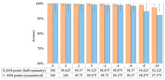 Furthermore, the conversion of time-domain signals into frequency-domain was symmetric. Following the FFT, the symmetric frequency spectrum with the length of 2048 was obtained from the sliced sample with 4096 points. Figure 13 depicts the effect of using the whole signal (4096) or symmetrical signal (2048) under different SNRs. Based on the results, the use of the entire signal achieved a greater fault detection compared to taking half of the signal (symmetric). Despite that the fault detection accuracy decreased as the noise increased, the use of the whole signal produced a more stable and less affected performance compared to the use of the half signal. The CNN would be more resilient to noise as a result of the symmetric nature of the input signal.