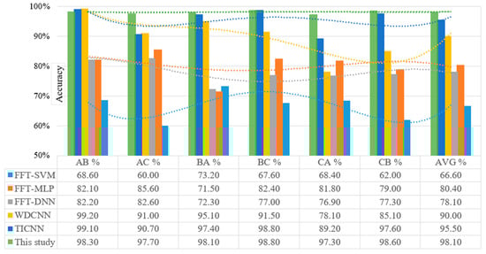 Figure 16 shows the poor performance of SVM, MLP, and DNN in terms of the domain adaptation analysis in the six scenarios with an average accuracy of 67%, 80% and 78%, respectively. In fact, the WDCNN and TICNN performed worse and never reached 90% and 95.5% accuracy, respectively. Oppositely, the proposed model in this study recorded greater precision than the other algorithms with up to 98.1%. Thus, demonstrating that the model learned from the frequency domain was more domain invariant compared to the conventional frequency features. In addition, the accuracy in each scenario improved by over 97% with high stability. As depicted in Figure 15, the proposed model exhibited a substantially greater classification accuracy when adapting from Domain A to B and B to A as well as from Domain B to C and C to B compared to from Domain A to C and C to A. Furthermore, the results showed that the model experienced greater difficulty to adapt to the new environment when the difference between the target domain and its source domain increased. The proposed model also recorded a high diagnostic accuracy of 98.8% when adapting from Domain B to C, while the accuracy was reduced by 1.5% only when adapting from Domain C to A. Besides the improved diagnosis accuracy, the proposed model achieved better stability compared to other reported models.