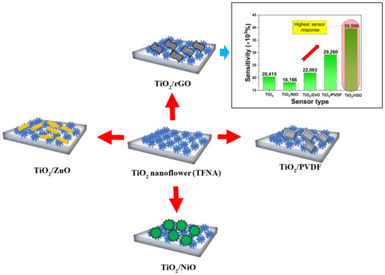 Unique three-dimensional (3D) titanium dioxide (TiO2) nanoflowers (TFNA) have shown great potential for humidity sensing applications, due to their large surface area-to-volume ratio and high hydrophilicity. The formation of a composite with other materials could further enhance the performance of this material. In this work, the effect of different types of composites on the performance of a TNFA-based humidity sensor was examined. NiO, ZnO, rGO, and PVDF have been explored as possible composite pairing candidates with TiO2 nanoflowers, which were prepared via a modified solution immersion method. The properties of the composites were examined using field emission electron spectroscopy (FESEM), X-ray diffractometry (XRD), transmission electron microscopy (TEM), X-ray photoelectron spectroscopy (XPS), current-voltage (I-V) analysis, Hall effect measurement, and contact angle measurement. The performance of the humidity sensor was assessed using a humidity sensor measurement system inside a humidity-controlled chamber. Based on the result, the combination of TiO2 with rGO produced the highest sensor response at 39,590%. The achievement is attributed to the increase in the electrical conductivity, hydrophilicity, and specific surface area of the composite.