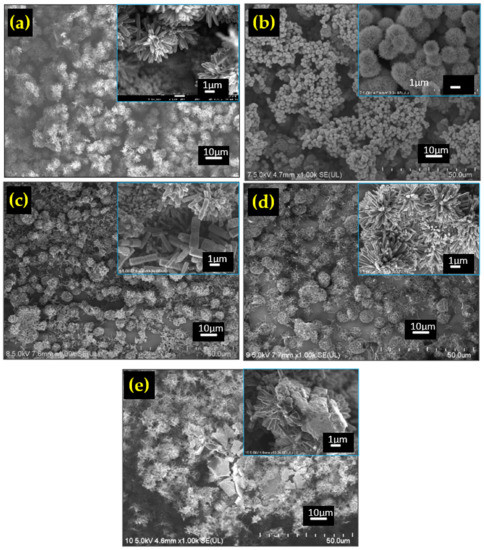 The FESEM images of all the prepared materials are shown in Figure 3a–e. The pure TiO2 sample in Figure 3a shows the TiO2 nanoflower (TFNA) structure that consisted of nanorods having an average diameter of around 150 nm. The average flower diameter is calculated to be around 4 µm. Meanwhile, the TiO2/NiO sample shows the presence of the NiO spherical structure, referred to as NiO nanoballs. Closer inspection reveals that the structure consists of a porous sheet. The diameter of the nanoballs was determined to be around 2 µm. Large voids are observed between the nanoball structures.