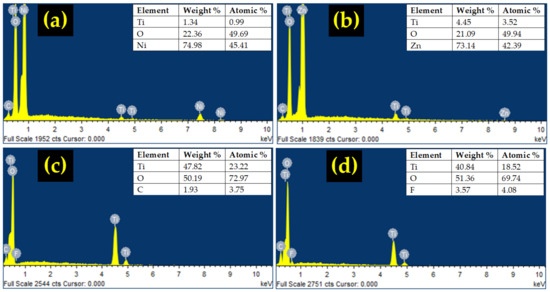 EDS analysis of: (a) TiO2/NiO, (b) TiO2/ZnO, (c) TiO2/rGO, and (d) TiO2/PVDF.