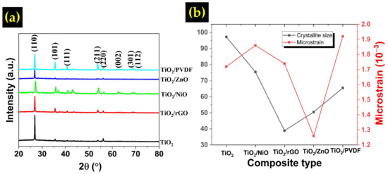 where is the full width at half maximum (FWHM), denotes the diffraction angle, is the dimensionless shape factor for the crystal, refers to the crystallite size, and is the microstrain of the crystal. By plotting against , the crystallite size could be determined from the slope while the intercept value determine the microstrain [29]. The calculated result is shown in Table 1 and Figure 5b. The pure TiO2 sample has the largest crystallite size at 97.2 nm followed by TiO2/NiO (75.4 nm), TiO2/PVDF (65.5 nm), TiO2/ZnO (50.5 nm), and TiO2/rGO (38.9 nm). The addition of a foreign compound often affects the crystal growth of TiO2, resulting in a smaller crystallite size. Accordingly, the microstrain value also increases in all the composites except for TiO2/ZnO. This might be due to the deformation, grain refinement and straining induced by foreign materials [30]. In their work, Luo et al. reported that the presence of rGO could suppress the grain growth of TiO2, consequently increasing the oxygen vacancy defect at the surface [31].