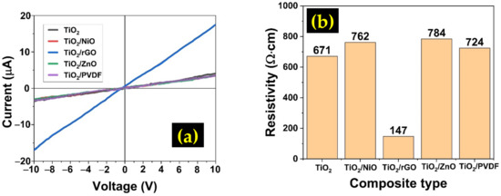 (a) I-V measurement result of different types of TiO2 composites, (b) Comparison of the resistivity value of different types of TiO2 composites.
