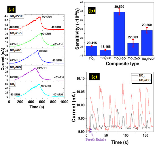 The variations in the current signal of the TiO2 composite samples as a function of the relative humidity (RH) level are depicted in Figure 8a. All samples show a steady increase in the current value as the moisture level was increased from 40 to 90%RH before reverting back to the initial value when the humidity was reduced back to 40%RH, which indicates that all samples are responding well to the changes in the humidity level. The following equation [43] was used to calculate the sensor response value: