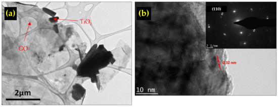 (a) TEM image of the TiO2/rGO composite, (b) SAED of TiO2/rGO.
