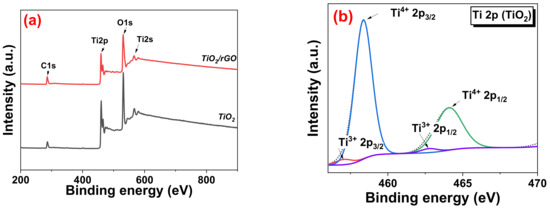 The XPS survey scan spectra of the TiO2 and TiO2/rGO sample is presented in Figure 10a. Both samples showed the presence of C 1s, Ti 2p, Ti 2s, and O 1s peaks, with the TiO2/rGO sample showing a higher intensity C 1s peak, due to the presence of rGO on the TiO2 nanoflower surface. The narrow scan of Ti 2p in Figure 10b,c reveals two prominent peaks at the binding energies of 459 eV and 464 eV corresponding to Ti 2p3/2 and Ti 2p1/2, respectively, which arises from spin-orbit splitting. A shoulder peak at 460 eV is noticeable in the TiO2/rGO sample, which suggested the presence of Ti3+ species [62,63]. This species is often considered responsible for the adsorption of water molecules by providing ample active sites [64]. Figure 10d reveals the narrow scan of C 1s. The deconvolution of the spectra reveals 5 peaks that can be assigned to carbon from C=C sp2, C-C sp3, C-O, C=O, and O-C=O bonds. Finally, Figure 10e,f show the core level scan O 1s of TiO2 and TiO2/rGO, respectively. The main peak at 530 eV is attributed to the lattice oxygen. For the TiO2/rGO sample, a peak is also observed at 530.7 eV, which corresponds to the oxygen vacancy [65]. Both samples also displayed a peak at 532.1 eV corresponding to chemisorbed oxygen [64]. It is reported that this oxygen species could play a part in the redox reaction on the surface of the material.
