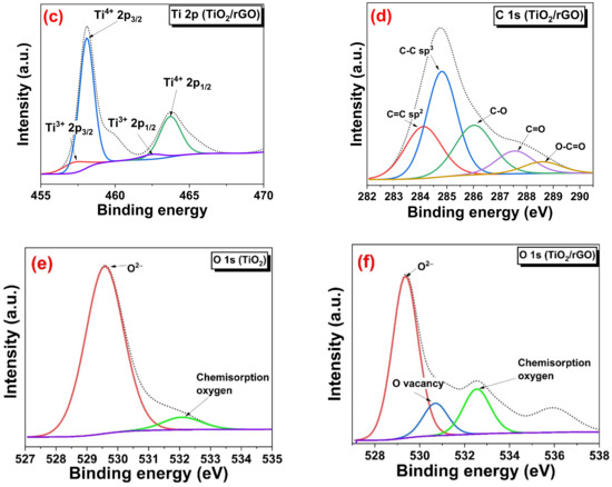 (a) XPS survey scan spectra, (b) narrow scan Ti 2p of TiO2, (c) narrow scan Ti 2p of TiO2/rGO, (d) narrow scan C 1s of TiO2/rGO, (e) narrow scan O 1s of TiO2, and (f) narrow scan O 1s of TiO2/rGO.
