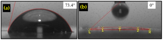 Contact angle measurement result of the (a) rGO thin film and (b) TiO2/rGO composite.