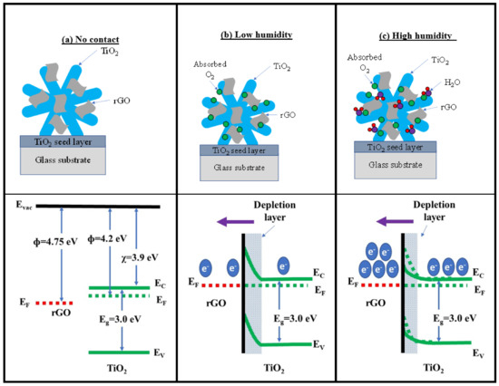 The proposed energy band diagram at the interface between TiO2 and rGO is exhibited in Figure 12a–c. The band gap energy, of rutile TiO2 is 3.0 eV [68] while the work function, and electron affinity, are 4.2 [69] and 3.9 eV [70], respectively. Meanwhile, the work function, of rGO is 4.75 eV [71]. It is estimated that a Schottky junction forms between TiO2 and rGO when they are in contact with each other due to the appropriate difference in work function between the two materials, as shown in Figure 12a. At a low humidity level, oxygen atoms from the air are adsorbed by TiO2 (Figure 12b). This process lowers the number of free electrons, and the depletion region becomes wide, prohibiting the transfer of charge across the junction. At this point, the resistance value between the metal contact is quite high. When water molecules in the environment increases, H2O, which is a reducing agent, increases the number of electrons in TiO2, which would be transported from the conduction band of TiO2 to rGO, effectively reducing the Schottky barrier with a narrower depletion region, as shown in Figure 12c. This reduces the depletion region width, and the conductivity between the material increases dramatically, which translates to the increase in the humidity sensor response. The synergistic effect of the combination of these two types of humidity sensing mechanisms produced an improved sensor response compared to the sensor response of a pure TiO2 based humidity sensor.