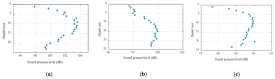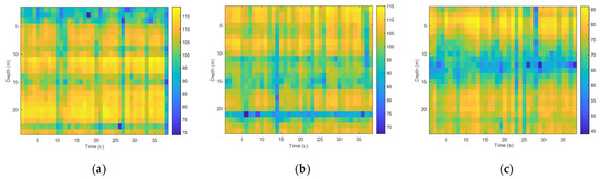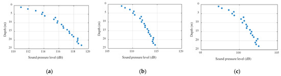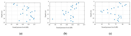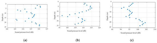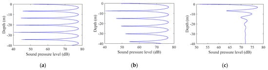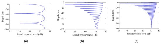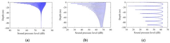 Figure 2 shows the signal interference patterns at different horizontal distances. The distances from (a) to (c) were 100 m, 300 m, and 1000 m, where the abscissa is the mark sound pressure level and the ordinate is the depth. Comparing the figures, the range of vertical fluctuations in sound intensity increased exponentially as the horizontal distance increased, which was consistent with the inference obtained using Formula (11). In the case of the same bandwidth, as the signal frequency and the horizontal distance increased, the sound intensity fluctuation was inversely proportional to the signal frequency and proportional to the horizontal distance; as the depth increased, the sound intensity fluctuation decreased.