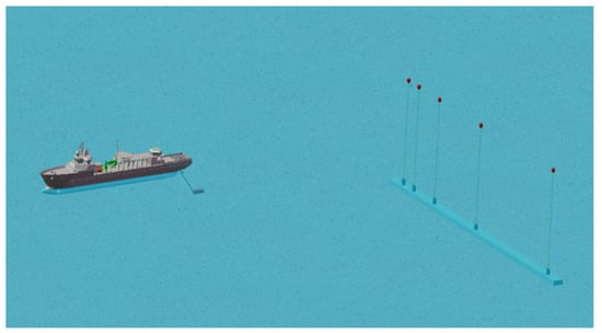 The depth of this experimental sea area was precisely 40 m. A signal-launching ship, which used a UW350 type transmitting transducer with a working frequency range of 20 Hz–20 kHz, was used for the transmission. The transmitting transducer was cylindrical with a diameter of 0.2 m and a length of exactly 1 m. The net weight was exactly 100 kg with its own hoisting device. The schematic diagram of the experiment is shown in Figure 4. The Xiangyang Hong 81 experimental ship was utilized to be the signal-receiving ship with five sub-arrays of the same specification for signal reception with a pitch of 1 m. When the signal-transmitting ship reached the preset position, it could transmit signals with different frequencies. The real-time positions of the signal-transmitting ship and the signal-receiving ship were recorded using GPS, which was used to calculate the relative distance between the transmitting and receiving ends.