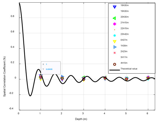 The time distribution characteristics of the noise field are mainly targeted at the commonly used high-speed underwater acoustic communication frequency bands of 5 kHz–20 kHz. According to the sound field analysis, in addition to the spatial distribution of the signal field due to the interference and the interface fluctuation, the influencing factors of the spatial variation range also have the spatial distribution of the system noise field. This study investigated the spatial distribution characteristics of the noise field in the 5 kHz–20 kHz frequency band with a general volume noise model [22]. It was assumed that all noise sources were uniformly distributed on an infinite plane; then, the spatial correlation coefficient of the marine environmental noise was simulated. In the ExQD_1701 experiment, the curve of the spatial correlation coefficient with respect to depth for a 10 kHz signal for 10 h is shown in Figure 9. The black dotted line is the theoretical value given by the general model of volume noise, and the spatial correlation of noise was small at high frequencies. Due to the correlation, calculations were performed between 30 array elements at different vertical depths and the no. 1 surface array element; consequently, the spatial correlation coefficient curve was clearly revealed. It was found that the curve matched the theoretical value given by the volume noise model. In subsequent high-frequency noise experimental data processing, the vertical correlation between array elements could be ignored.