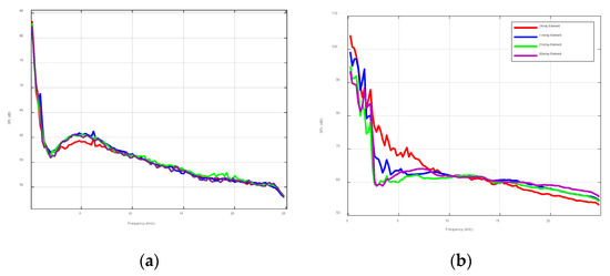 In order to discuss the spatial distribution of wind and wave noise, the environmental noise was collected by using an array in ExQD_1701. The seabed in the experimental sea area was approximately the same level. The water depth was 40 m and the wind speed during the experiment was approximately 3 m/s. There were no other vessel activities within 5 km. Figure 10a indicates the noise field distribution of the marine environment at different depths, and Figure 10b shows the noise field distribution with the ship’s self-noise. The no. 1 array element was an offshore array element, and the no. 30 array element was a near-seabed array element. The ship’s self-noise had a greater impact on the frequency band below 5 kHz, which gradually decreased with the increase in depth and slightly fluctuated at high frequencies. Underwater acoustic communications often utilize high-frequency bands, with an associated 5 dB of noise fluctuations. The spatial distribution of environmental noise was not obvious and it was mainly because the surface noise source was a surface source composed of multiple noise sources. During the propagation process, the noise signals overlapped and neutralized each other with relatively small spatial fluctuation.