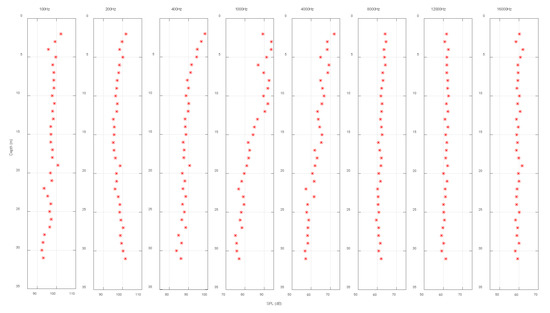 The former simulation experiments demonstrated that when the signal frequency was low, the fluctuation was large. First, the experiment processed and analyzed the low-frequency signal data below 1 kHz. During the experiment, single-frequency signals of 95 Hz and 400 Hz were transmitted, and the sound source level of the transmitting transducer was stable. In order to summarize the spatial distribution of signals, Figure 5 and Figure 6 display the vertical distribution of sound pressure levels for single-frequency signals of 95 Hz and 400 Hz when the relative distances between the transmitting and receiving ends were different. The abscissa is the received sound pressure level and the ordinate is the water depth. By comparing different distances, frequencies, and depths, the spatial fluctuation characteristics of the signal could be summarized. When the signal frequency was low, the sea trial results fit well with the simulation results. As for the normal wave, the fluctuation law could be described as: the modes of the normal wave excited at different frequencies were different. The higher the frequency was, the greater the number of modes, and the more complicated the signal fluctuation law. This rule can be used to guide the equipment placement of low-frequency remote UAC systems.