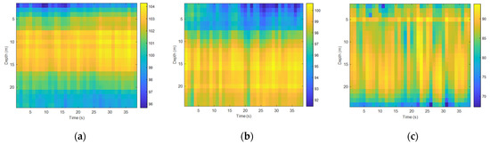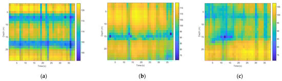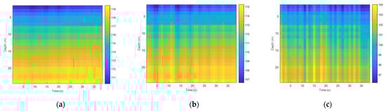 First, we analyzed the time fluctuation of the low-frequency signal. The frequencies of the transmitted signal were 95 Hz and 400 Hz, and the sound source level of the transmitted transducer was stable. Figure 12 and Figure 13 show the spurious color maps of the spatiotemporal distribution of the single-frequency signals (95 Hz and 400 Hz) at different distances. The vertical axis represents the water depth; the horizontal axis is the time when the signal was collected. With the increase in the horizontal distance between the transmitting and receiving ends, the signal strength increased significantly with time, which verified the conclusion of the theoretical calculations. The variation law of the signal intensity in the vertical direction was also consistent with the previous experimental results. When the frequency remained unchanged, the time fluctuation of the near-sea surface signal was larger than the sea floor fluctuation with the increase of the horizontal distance. With the increase in frequency, the number of normal wave modes of the signal field increased and the time fluctuation became stable.