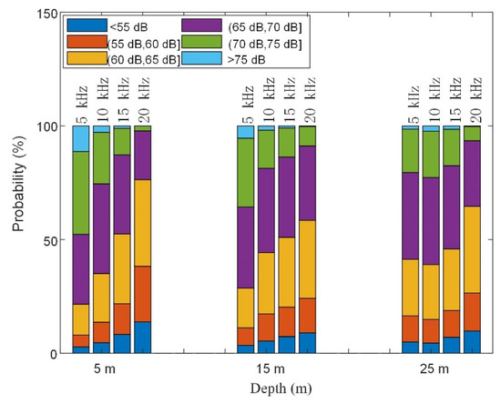 The time distribution characteristics of the noise fields were mainly targeted at the commonly used high-speed underwater acoustic communication frequency bands of 5 kHz–20 kHz. According to the foregoing, the vertical elements of the noise distribution were weakly correlated to each other. Therefore, the array elements at 5 m, 15 m, and 25 m were selected as research objects to study the noise time distribution in the surface, seabed, and water column situations. In the ExQD_1701 experiment, the environmental noise data in the experimental stage was randomly taken for 600 s, and a 1 s Hanning window was applied to intercept the data at an overlap rate of 0.66. Therefore, a total of 1762 sample points were obtained. Statistics of narrow-band noise distribution at different frequencies are shown in Figure 16. In the high-frequency range, the environmental high-frequency noise was mainly distributed in the 60 dB to 70 dB range. As the frequency increased, the noise intensity gradually decreased; the noise intensity also gradually decreased as the depth increased. This was found to be in accordance with the theoretical model.