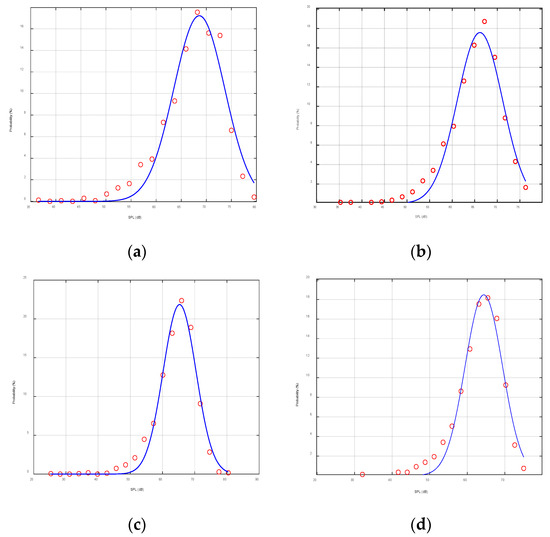 In Figure 17, subfigure (a) shows the time probability distribution of the 5 kHz narrowband noise with a mean of 68.59 dB and a standard deviation of 5.08 dB, subfigure (b) shows the time probability distribution of the 10 kHz narrowband noise with a mean of 66.16 dB and a standard deviation of 5.01 dB, subfigure (c) shows the time probability distribution of the 15 kHz narrowband noise with a mean of 65.30 dB and a standard deviation of 5.10 dB, and subfigure (d) shows the 20 kHz narrowband noise time probability distribution with a mean of 64.39 dB and a standard deviation of 4.97 dB. A comparison of these figures demonstrated that the probability of noise intensity basically followed the Gaussian distribution with a relativity small fluctuation on the time scale. As shown in Figure 17, the mean decreased with increasing frequency while the standard deviation remained stable.