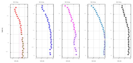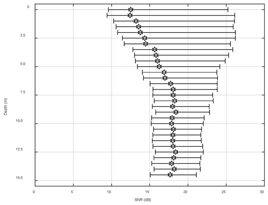 Figure 19 demonstrates the statistical range of the space-time variation of the SNR of array 5 over 31.5 s. The black hexagon indicates the mean of the SNR within the changing range, which is in line with Figure 18. From the figure, it was relatively small and fluctuated dramatically, which matched the trend of the spatial and temporal distributions of the signal field and noise field of the single-frequency signal. However, the experimental signal was further processed to cope with the slight inconsistency of the fluctuation range. Signals with center frequencies of 9 kHz and 15 kHz and a length of 31.5 s were selected. The sampling frequency of the system was 50 kHz and the number of sample points was about 1,574,520. The processing results are shown in Figure 20 and Figure 21. In these figures, the abscissa is the SNR and the ordinate is the depth, and the plots show the variation ranges of the SNR within the signal time of 31.5 s at different depths, with the blue point representing the mean value. With the increase in the processing bandwidth, the spatial-temporal variation range of the SNR was significantly reduced, and the SNR of the surface array elements in the vertical direction was significantly lower than that in the water array elements, which verified the laws obtained using the theory and simulation experiments.