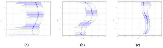Signal-to-noise ratio vertical distribution (15 kHz): (a) bandwidth at 1 Hz, (b) bandwidth at 10 Hz, and (c) bandwidth at 500 Hz.
