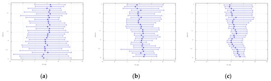 Figure 3 shows the signal interference diagrams at different bandwidths. The bandwidths from (a) to (c) were 1 Hz, 10 Hz, and 100 Hz, where the abscissa is the signal sound pressure level and the ordinate is the depth. It can be seen from the comparison of the figures that as the bandwidth increased, the vertical fluctuation range of the sound intensity decreased exponentially until it tended to be stable in the end.