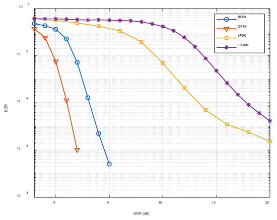 Figure 22 shows the simulation experiments performed under the fixed coding method using the channel parameters in the ExDQ_1702 experiment and the bit error rate corresponding to different signal-to-noise ratios (SNRs) and mapping methods. It can be seen that as the SNR increased, the bit error rate decreased. When the SNR in the experiment is less than 10 dB, the system should avoid using the 16QAM mapping method with a bit error rate higher than 0.01 and select other mapping methods according to the actual effective rate requirements.