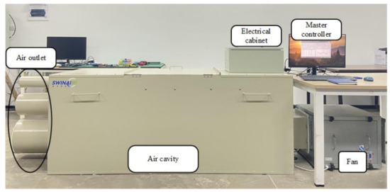 The photo of calibration device prototype is shown in Figure 2. The device has three air outlets of different diameters. Users can choose a suitable diameter of air outlet according to the range of air flow measurement, and the other two will be blocked by physical blocking. The electrical cabinet contains electrical switches, a switching power supply, an intermediate controller, a 485 hub, and a frequency converter. The master controller consists of a 485 adapter, a Raspberry PI, and accessories. The Raspberry PI communicates with the controller and the VAV terminal units based on Modbus. The fan is controlled by a frequency converter. The Raspberry PI sends instructions to the intermediate controller by Modbus. The intermediate controller handles the command, and outputs a 0~10 V voltage signal to control the converter. The different frequency of the converter controls the amount of air flow inside the device.