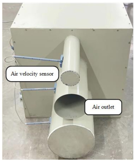 The cross-sectional area of the biggest one in three air outlets is , and the maximum wind speed that the fan can blow is . Therefore, the maximum range of air flows is 0 to 3815.1 cmh. The range of air flow measurement corresponding to three air outlets is shown in Table 1. In addition, the volume size of the VAV terminal unit is limited due to the limited space in the chamber. The maximum length of the VAV terminal unit that can be measured is 85 cm. If the VAV terminal unit is square, the maximum cross-sectional area is 2500 cm2. If the VAV terminal unit is round, the maximum cross-sectional area is . If the VAV terminal unit meets the above range requirements, then calibration tasks can be performed with this device.