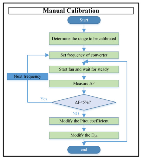 In step 2, the is the pressure measurement deviation and is determined by the calibration of a low air flow value. Firstly, the system controls the fan to reach the minimum air flow in the range, starts the fan, and then waits for a period of time until the air flow is stable. When the data are stable, the system obtains the value of after reading multiple groups of data and calculating the average. If the 5% requirement is not met, the value of will be updated after calculating, and the preceding operations are repeated.