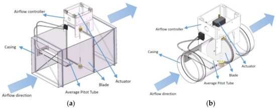 Structure of VAV terminal units. (a) Square VAV terminal unit; (b) circular VAV terminal unit.