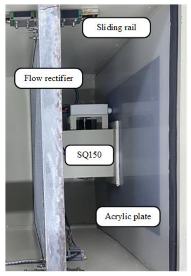 Hardware preparation is required before calibrating the air flow sensor of the VAV terminal unit. As shown in Figure 9, a SQ150 VAV terminal unit is ready for calibration. The SQ150 is placed on the bracket and the acrylic plate is close to the air outlet of VAV terminal unit and flow rectifier by cutting a suitable caliber. In addition, it is convenient to move the flow rectifier on the slide so that it can be close to the air inlet of the VAV terminal unit.