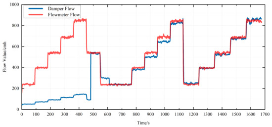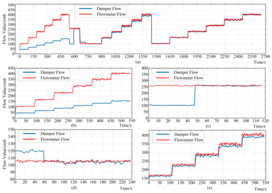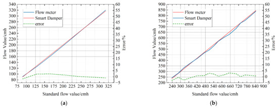 During the calibration process of air flow measurement for SQ150, a comparison trend of air flow measurement measured by the air flow sensor of VAV terminal unit and air flow measurement measured by standard flow meter is shown in Figure 10a. In order to show the complete calibration process, a comparison of air flow before and after calibration is added. It can be clearly seen from the figure that the air flow measurement measured by the air flow sensor of the VAV terminal unit is adjusted from a large error at the beginning to a small error at the end.