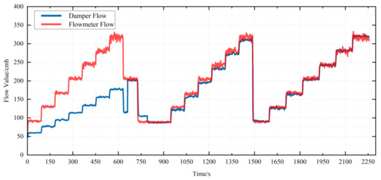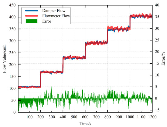 After SQ150’s calibration, the and are set. In order to further verify the correctness of the calibration results, the and are not adjusted and the measurement is compared again. A comparison diagram of the air flow measured by the air flow sensor of VAV terminal units and the air flow measured by the standard flow meter and its error trend are shown in Figure 11. It is obvious that the air flow measured by the air flow sensor of VAV terminal units and the air flow measured by the standard flow meter almost coincide after calibration. Although there are slight fluctuations caused by environmental and measurement disturbances, the overall trend remains within 5% of the error requirement.