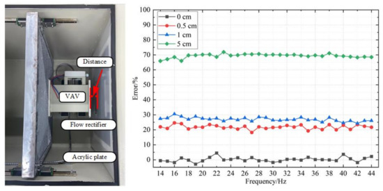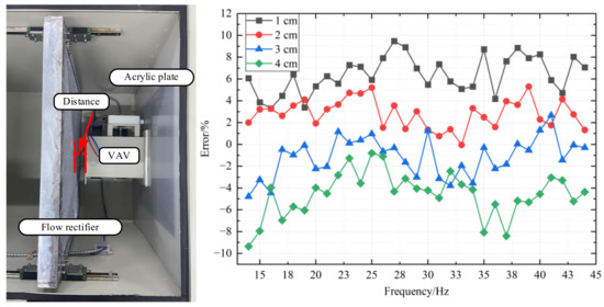 The error between the air flow measured by the air flow sensor of the VAV terminal unit and the air flow measured by the standard flow meter is recorded at different distances by constantly adjusting the distance. Meanwhile, the major errors of different distance are shown in Figure 15. It is obvious that the error is perfectly maintained within 5% when the distance is 0 cm. When the distance increases slowly, there is a slight oscillation from 0 to 1 cm, and the error expands to 10%. In the range of 2~3 cm, the error recovers within 5%. When the distance exceeds 3 cm, the error continues to widen and begins to produce violent oscillations. In addition, when the distance is in range of 2~3 cm, although the error is still within 5%, it is obviously oscillating. When the distance becomes larger, the effect of flow rectifiers on the air flow gradually weakens, resulting in the air flow becoming irregular and the accuracy of measurement being affected.