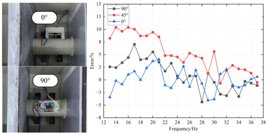 In the calibration experiments, when the VAV terminal unit is placed on the bracket, the different angles of VAV terminal unit will also influence the calibration result. This is caused by the measurement characteristics of the air flow sensor. Therefore, we calibrate the VAV terminal unit at 0° and recode its system parameters. With these parameters, experiment data of 0°, 45°, and 90° are recorded, respectively. By analyzing the errors between the data measured by the VAV terminal unit and the data measured by the standard flow meter at different angles, a diagram of errors is shown in Figure 17. It is evident that the error of VAV terminal unit is calibrated within 5% at 0°, while there is a slight oscillation at 90°, especially at low air flow values. In addition, we also carry out an experiment on the placement position of 45°. An angle of 45° will negatively influence the results, causing severe jitter of the measurement results. This is because the VAV terminal unit cannot be fixed well in 45°, and the unstable flow of air flow disturbs the VAV terminal unit. Therefore, the measurement accuracy is seriously affected.