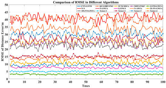 Figure 3, Figure 4, Figure 5 and Figure 6 also show the performance of each component of the LSTM-GWFA. The N-N algorithm without LSTM and GWFA did not achieve any improvement, and its stability and accuracy of fusion were the worst. Even the fusion results exceeded the sensor observation, with the lowest accuracy affected by the iterative cumulative error. On the basis of the N-N algorithm, the performance of the N-LSTM algorithm after adding GWFA can be significantly improved, but the performance decreased after replacing AWFA, which shows that GWFA is more adaptive to filtering than the given mean value. When the stage of GWFA was removed based on the LSTM-GWFA algorithm, the performance of LSTM-GWFA was only slightly weakened, which was equivalent to or even better than that of CNN-LSTM. On the other hand, the base line had great performance improvement after adding the stage of LSTM, which was enough to show that LSTM is the core part of the architecture. Therefore, we further replaced the LSTM network with the traditional NN with different training steps for testing. The performance of 5S-NN-GWFA and 10S-NN-GWFA were fragile compared with that of LSTM, but it could be seen that the alternative network of short-step training was significantly better than that of long-step training in the fusion architecture. From the overall algorithm comparison, FCM-MSFA and MHT-ENKF as traditional filtering algorithms had almost no difference in fusion performance. CNN-LSTM and KF-GBDT-PSO algorithms were improved by adding the NN algorithm, but their curve trend of RMSE was similar, indicating that the network structure had not changed, which affected the fusion performance. The LSTM-GWFA in this paper also used NNs combined with the measurement variance of real-time data, but not all of them. The improvement of the efficiency and stability of the algorithm also benefited from the motion maneuver detection filter and adaptive truncation weight, which not only greatly reduced the error of the fusion results but also made the accuracy of all individual radars high.