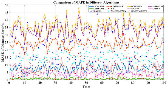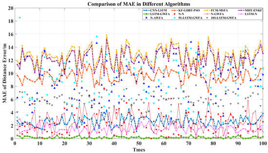 All the operation data of the tracking aircraft of the four sensors were collected by the mean sampling method and the sampling frequency of each associated feature was unified as 0.5 s. If there were missing data in the sampling time period of a sensor, the data of the previous time were used to make up the missing value. Due to the large difference in the value range of each measurement point, the minimum and maximum normalization method was used to normalize the features of each dimension to eliminate the impact of the difference in value range on the accuracy of the model. We obtained 871 times track sampling data and the column data of each track were different. The data in the dataset were a three-dimensional feature, then 671 pieces were used as a training set, 100 pieces were used as a verification set, and 100 pieces were used as a test set. We considered the comparison with various existing advanced algorithms, and compared the final 100 data fusion results with CNN-LSTM [39], KF-GBDT-PSO [40], FCM-MSFA [41], and MHT-ENKF [42]. CNN-LSTM was used to predict the trajectory of sick gait children in the original reference. This paper modified the training content of CNN-LSTM as speed and acceleration, with a sliding window from 5 to 10, which matches the task of this study. KF-GBDT-PSO was used for multisource sensor data fusion to improve the accuracy of vehicle navigation in original reference. This paper took the KF-GBDT-PSO as the output of the prediction model directly and fused it with real-time observation directly as the final result. FCM-MSFA is a weighted integral data fusion algorithm for multiple radars which was proposed to reduce the error of observation trajectory and improve the accuracy of the system in the original reference. This paper ignored the correction action of FCM-MSFA on radar and retained the interference of acceleration speed, regarded as an interference input with random characteristics. MHT-ENKF is a modified ensemble Kalman filter (EnKF) in the multiple hypotheses tracking (MHT) to achieve more accurate positioning of the targe with the high nonlinearity in original reference. This paper used the data process of a single target trajectory of MHT-ENKF and ignored the trajectory correlation part, which the result as prediction of a sensor. Then, this paper adjusted the data acquisition frequency of all algorithms to 0.5 s.