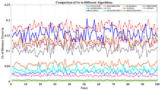 In order to compare the advantages of the components of LSTM-GWFA, six comparison algorithms were added, which are N-N, N-GWFA, LSTM-N, N-AWFA, 5S-NN-GWFA, and 10S-NN-GWFA. The algorithm of N-N was used to remove the stages of LSTM and GWFA and preserve the rest in the algorithm of LSTM-GWFA. The algorithm of N-GWFA was used to remove the stage of LSTM and preserve the rest in the algorithm of LSTM-GWFA. The algorithm of LSTM-N was used to remove the stage of GWFA and preserve the rest in the algorithm of LSTM-GWFA. The above three algorithms were for ablation analysis to demonstrate their advantages. The algorithm of N-AWFA was used to replace the global Kalman filter with a mean value in the algorithm of N-GWFA. The algorithms of 5S-NN-GWFA and 10S-NN-GWFA were used to replace the stage of LSTM with neural networks (NN) with different training prediction steps (5 and 10) in the algorithm of LSTM-GWFA. The above three algorithms were for optimization and comparison of LSTM-GWFA algorithm components. Then, we made a simple analysis for added algorithms by RMSE and IA and used Equations (35)–(38) to compare the statistical results as shown in Figure 3, Figure 4, Figure 5 and Figure 6.