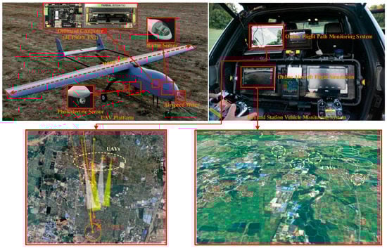 In the task of tracking enemy aircraft for air combat, this research used a data fusion scene composed of UAVs with sensors and enemy aircraft, as illustrated in Figure 1. There was a complete data link between UAVs which could communicate with each other at any time. Each UAV carried only one type of detection sensor (photoelectric or radar sensor). Enemy aircraft attempted to escape tracking through various maneuvers, causing errors in the continuous detection of their position by UAVs. When the sensor detection of more than two UAVs obtained the position of the enemy aircraft, data fusion could be carried out and the final fusion results would be shared to realize the cooperative tracking of multiple UAVs. Then the UAVs with lost tracking field of view could be redirected to the correct tracking path. The research content of this paper is the process of autonomous data fusion after the UAVs obtained the multisource state of enemy aircraft using multisensors.